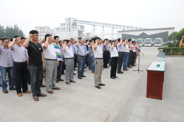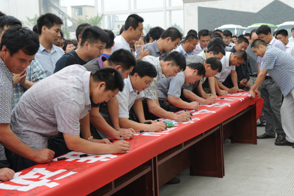 随后,在采掘办公楼前,副总工程师以上领导、机关科室人员及生产区队干部职工代表400余人,在矿长张运宪的带领下进行安全宣誓,参加人员举起右手,握紧拳头,一字一句跟随张矿长庄严宣誓,确保安全生产。参会人员在写有"强化安全基础,推动安全发展"的条幅上签上自己的名字,保证安全生产。接着,一同观看了"反三违打三非"安全教育警示挂图展览。