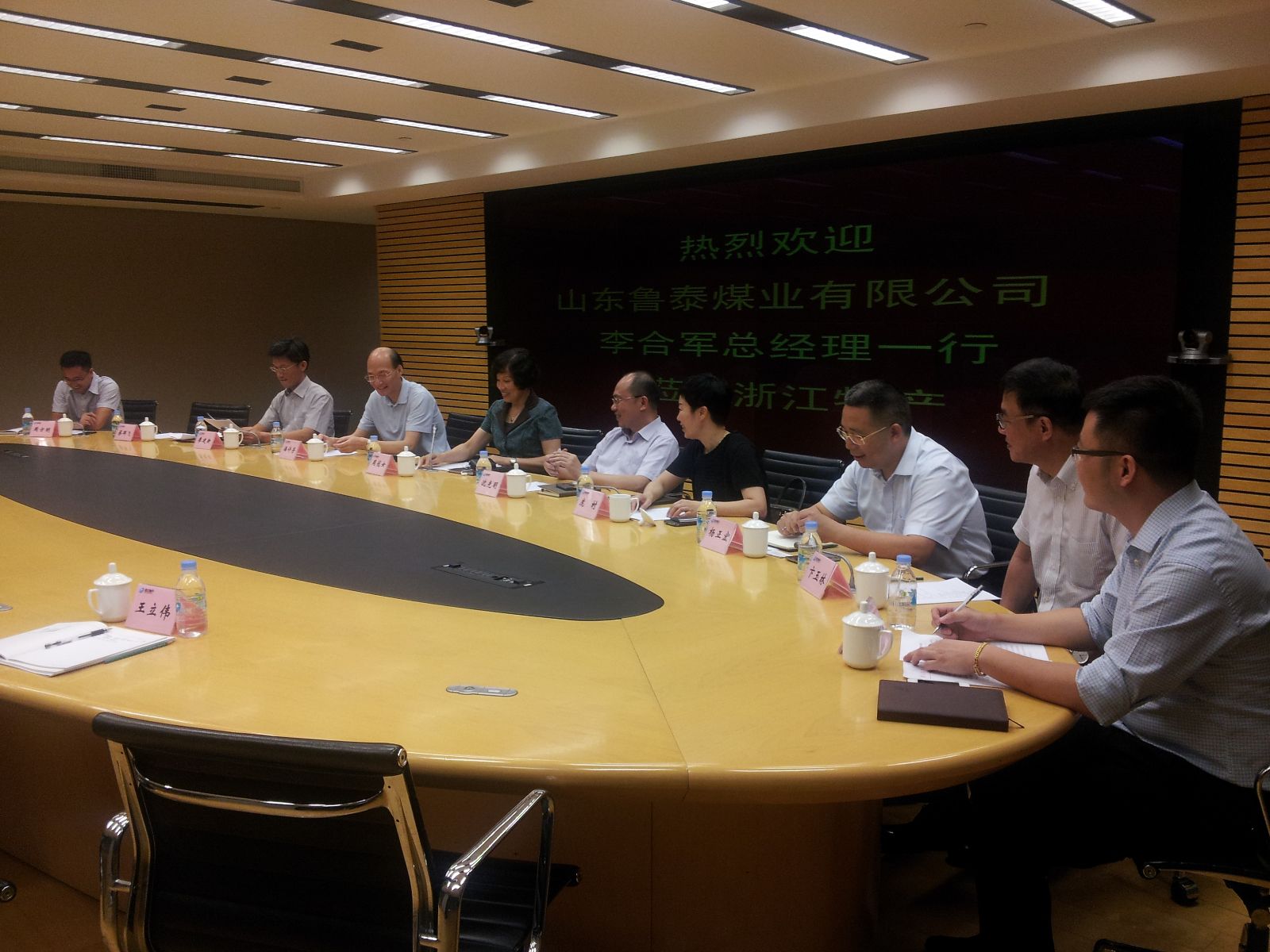 8月5日上午,公司总经理李合军带队,公司人力资源部、财务部、运销部、规划发展部、金威煤电等相关负责人一行6人赴浙江省物产集团调研考察,并就双方合作事宜进行探讨交流。浙江物产集团总经理周冠女、副总经理沈光明,浙江物产化工集团公司董事长庞村、副总经理蔡群飞,浙江物产能源股份公司董事长潘许芳、总经理杨正宏等领导陪同考察。